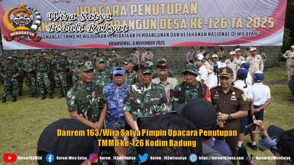 Badung, Upacara Penutupan TNI Manunggal Membangun Desa (TMMD) ke-126 Tahun Anggaran 2025 mengambil tema “Dengan Semangat TMMD Mewujudkan Pemerataan Pembangunan Dan Ketahanan Nasional Di Wilayah” yang digelar di Lapangan Sepak Bola Desa Taman,  Kecamatan Abiansemal, Kab.Badung, pada Kamis (6/11/2025), Upacara penutupan dipimpin langsung oleh Danrem 163/Wira Satya (Brigen TNI Ida Idewa Agung Hadisaputra) sebagai Inspektur Upacara. Kegiatan ini juga turut dihadiri oleh Bupati Badung Di wakili oleh Kaban Kesbangpol , Dan unsur Forkopimda Badung, pejabat pemerintah daerah, serta tokoh masyarakat.