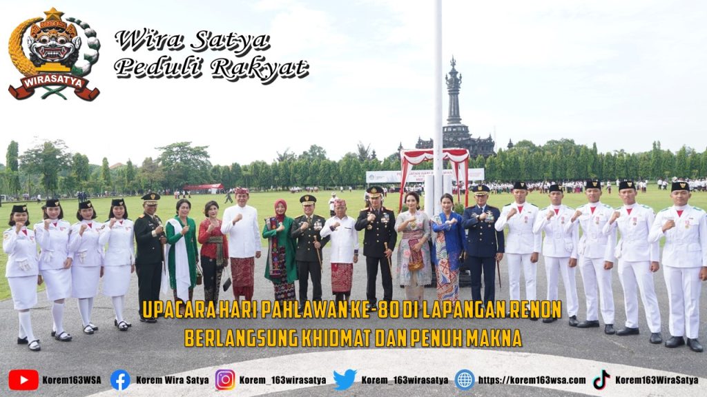 Denpasar, Danrem 163/Wira Satya Brigjen TNI Ida Idewa Agung Hadisaputra di dampingi Ketua Persit KCK Koorcab Rem 163 PD IX Udayana Ny. Ayu Agung Hadisaputra, menghadiri kegiatan upacara Hari Pahlawan ke-80 Tahun 2025, Bertempat di Lapangan renon, di Kelurahan Renon, Denpasar Selatan, Kota Denpasar, pada hari Senin (10/11), Upacara yang mengusung tema “Pahlawan Teladanku, Terus Bergerak Melanjutkan Perjuangan” tersebut dipimpin langsung oleh Gubernur Bali Wayan Koster. Kegiatan ini diikuti oleh seluruh Prajurit, PNS Kodam IX/Udayana, Forkopimda, ASN, pelajar dan masyarakat.
