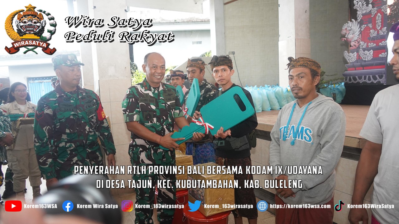 Buleleng, Danrem 163/Wira Satya (Brigjen TNI Ida Idewa Agung Hadisaputra) mendampingi Pangdam IX/Udy (Mayjen TNI Piek Budyakto) melaksanakan kegiatan Penyerahan RTLH Prov. Bali Bersama Kodam IX/Udy bekerjasama dengan PT Lion Group Wilayah Bali Nusra oleh Gubernur Bali diwakili Kadis Perkimta Prov. Bali (Nusakti Yasa Wedha, S.T., M.T) serta diikuti ± 150 Orang, bertempat di Wantilan Desa Tajun, Banjar Dinas Desa, Ds. Tajun, Kec. Kubutambahan, Kab. Buleleng. Pada hari rabu (14/1/2026).