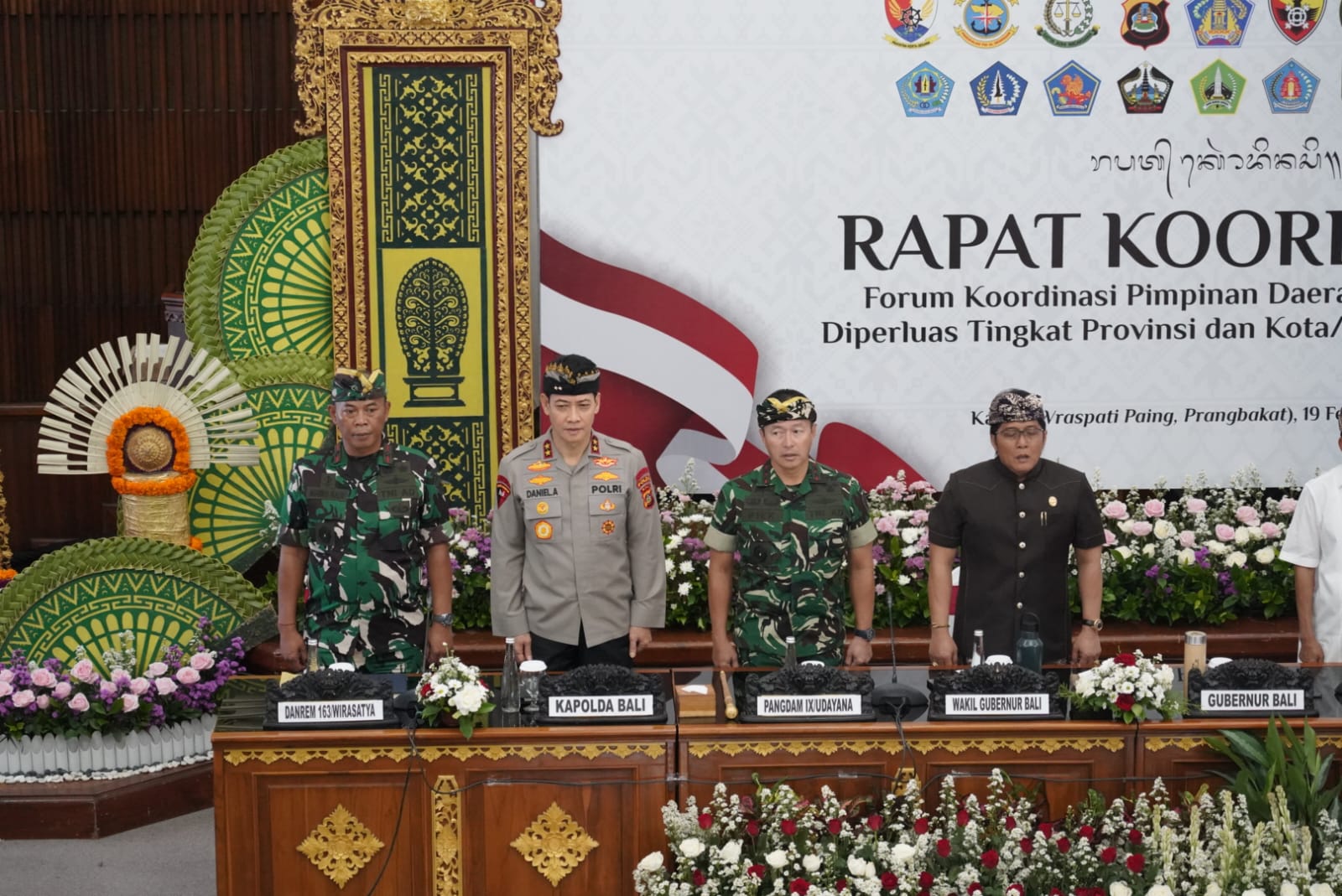 Denpasar, Danrem 163/WSA Hadiri Kegiatan Rapat Koordinasi Forum Koordinasi Pimpinan Daerah (Forkopimda) diiperluas Tingkat Provinsi dan Kota/Kabupaten se-Bali Tahun 2026, yang dipimpin oleh Gubernur Bali (Dr. Ir. I Wayan Koster, M.M). dan dihadiri sekitar ± 100 orang, Bertempat di Ruang Rapat Wiswa Sabha Utama, Kantor Gubernur Bali, Jl. Basuki Rahmat No.1,Ds. Sumerta Kelod, Kec. Denpasar Timur, Kota Denpasar, Kamis (19/2/2026).