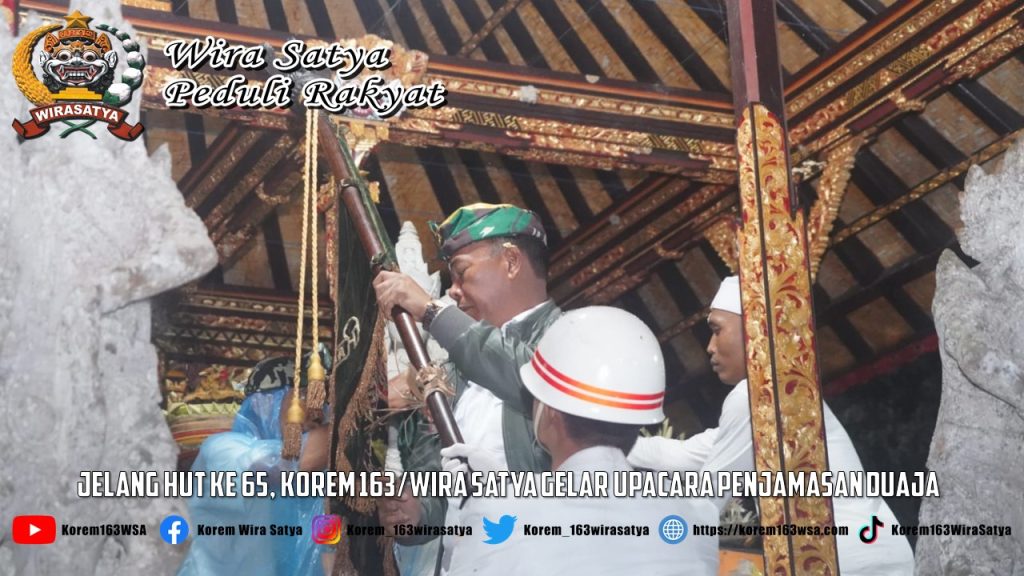 Gianyar, Dalam rangka menyambut Hari Ulang Tahun ke 65, Danrem 163/Wira Satya (Brigjen TNI Ida Idewa Agung Hadisaputra) memimpin Upacara Penjamasan Duaja Korem 163/Wira Satya, di Pura Gunung Kawi, Kecamatan Tampaksiring, Kabupaten Gianyar, pada Senin (23/2/2026).