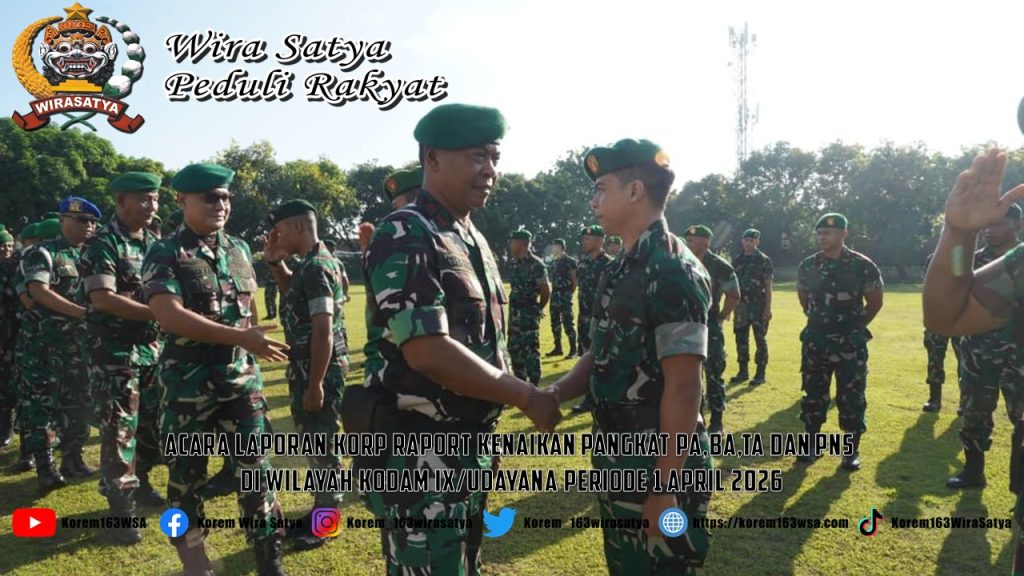 Denpasar, Bertempat di Lapangan Makorem 163/Wsa, Jl.PB Sudirman, Kec. Denpasar Barat, Kota Denpasar Danrem163/WSA menghadiri Acara laporan korps kenaikan pangkat Pa,Ba,Ta, dan PNS di Wilayah Kodam IX/Udayana periode 1 April 2026 yang dipimpin oleh Kasdam IX/Udayana, Brigjen TNI Taufiq Hanafi, diikuti ratusan personel, Rabu (1/4/2026).
