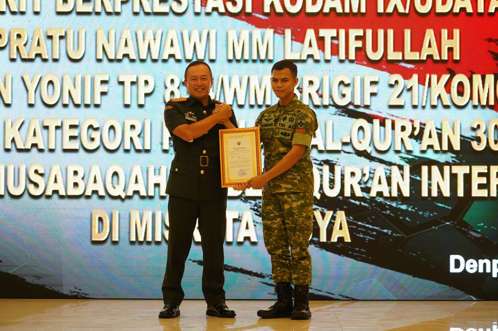 Kegiatan ini juga dirangkaikan dengan pemberian penghargaan kepada Pratu Nawawi MM Latifullah yang meraih Juara I hafalan Al-Qur’an 30 Juz pada ajang Musabaqah Hifdzil Qur’an Internasional di Misurata, Libya.